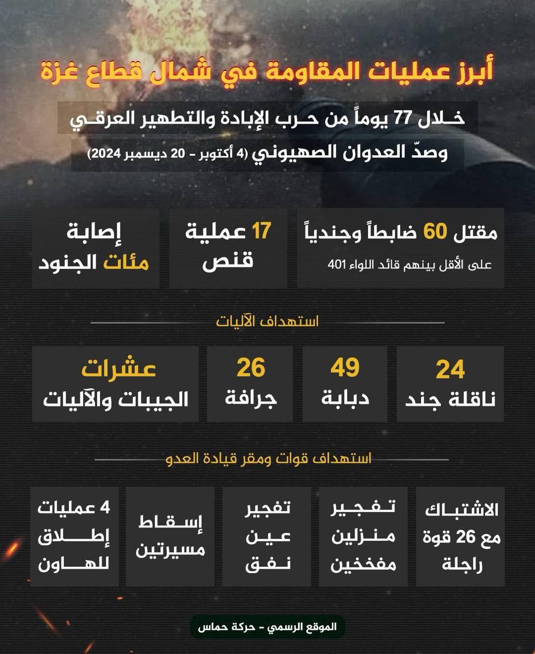 أبرز عمليات المقاومة في شمال قطاع غزة خلال 77 يوماً من العدوان الصهيوني وحرب الإبادة (إنفوجرافيك)