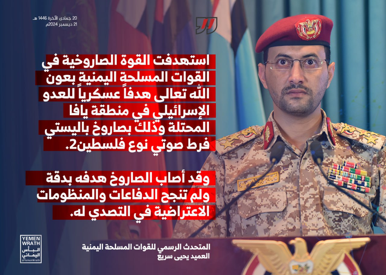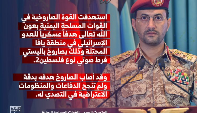 بيان القوات المسلحة اليمنية بشأن تنفيذ عملية عسكرية استهدفت هدفا عسكريا للعدو الإسرائيلي في منطقة يافا المحتلة بصاروخ باليستي فرط صوتي فلسطين2.