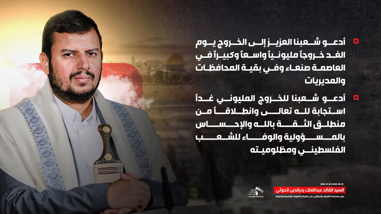 السيد القائد: أدعو شعبنا العزيز إلى الخروج يوم الغد خروجاً مليونياً واسعاً وكبيراً في العاصمة صنعاء وفي بقية المحافظات