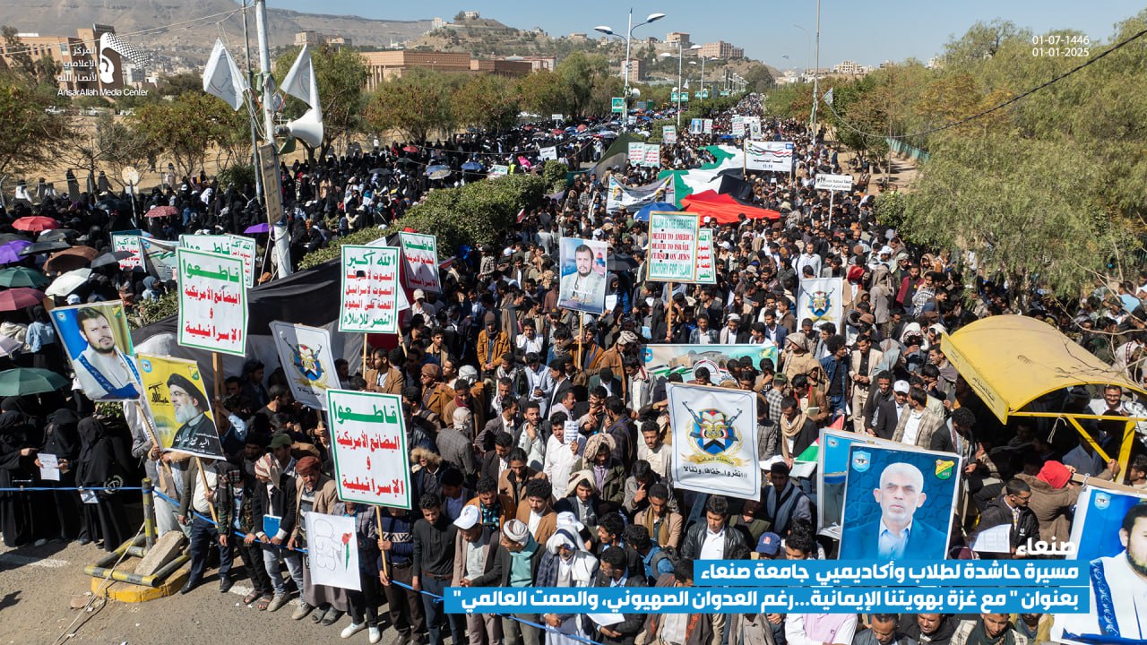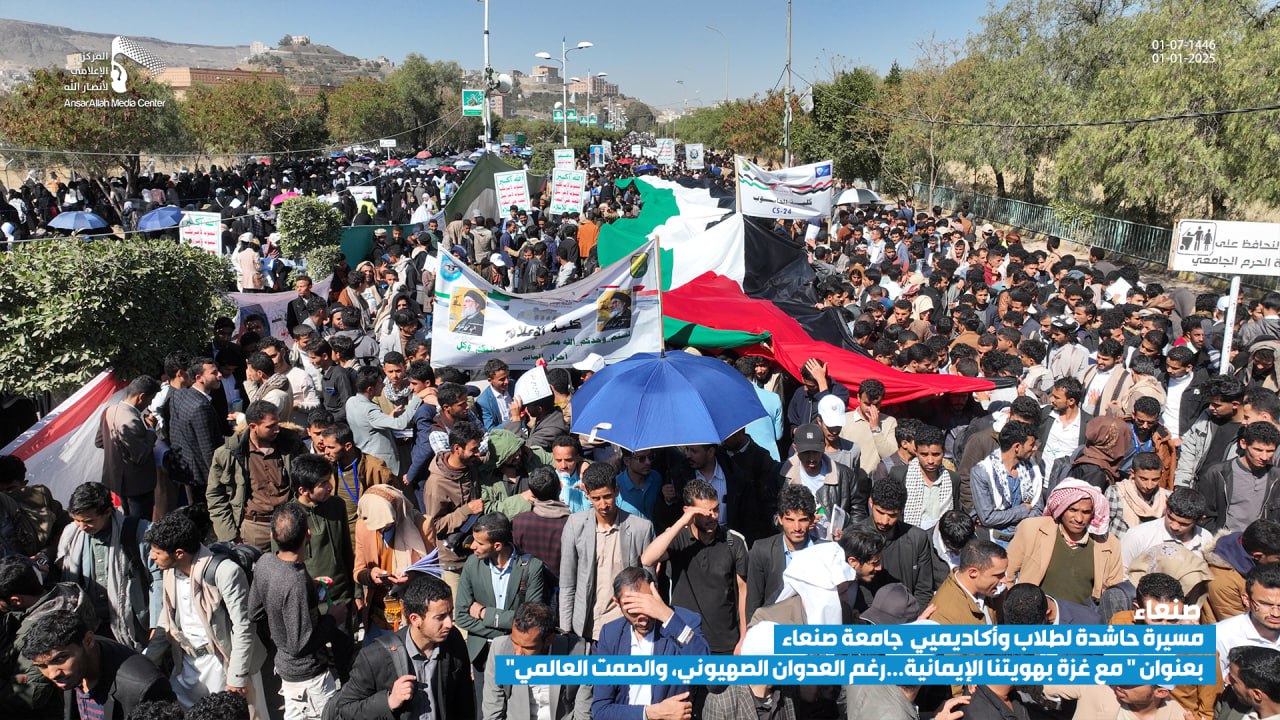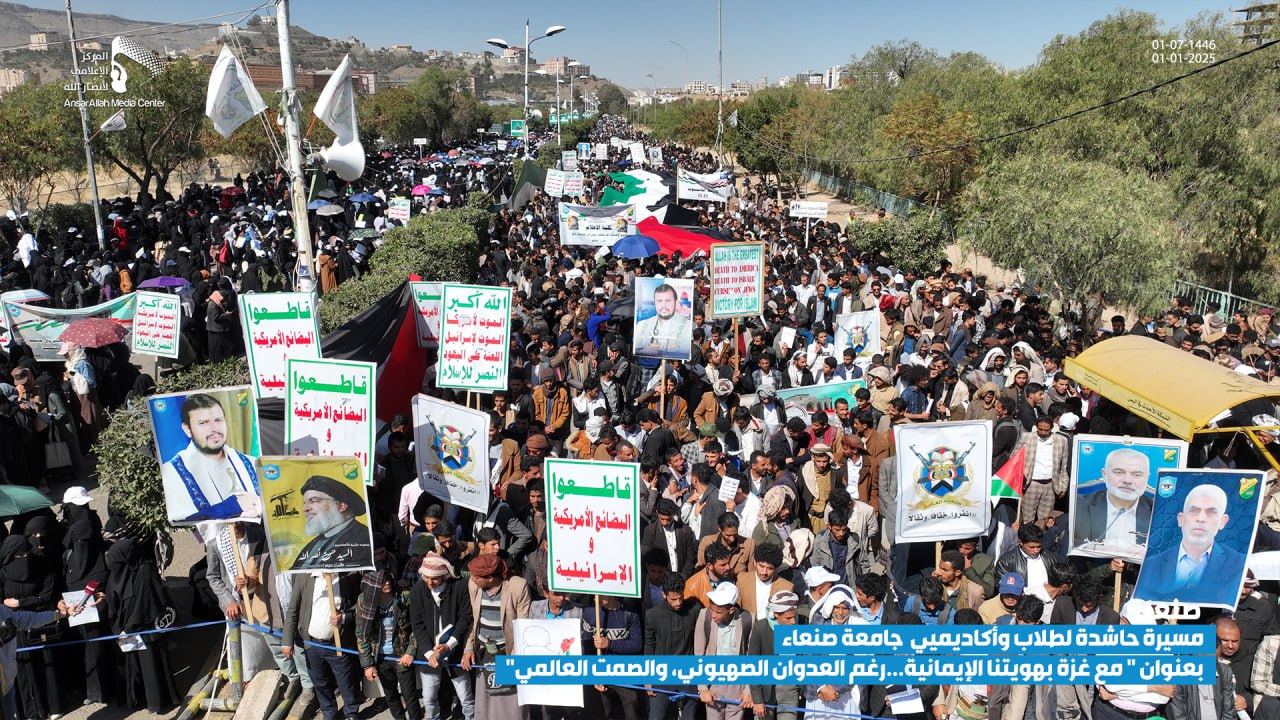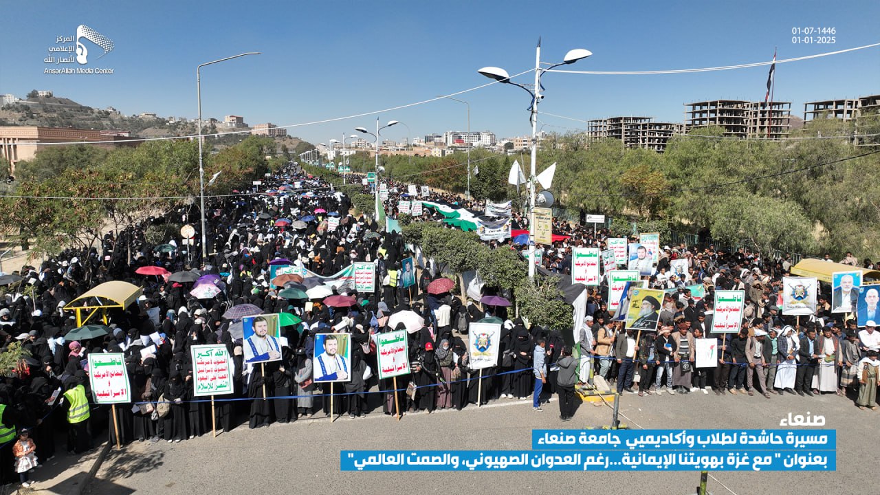 صور| مسيرة حاشدة لطلاب وأكاديميي جامعة صنعاء بعنوان “مع غزة بهويتنا الإيمانية…رغم العدوان الصهيوني، والصمت العالمي” 01-07-1446هـ | 01-01-2025م