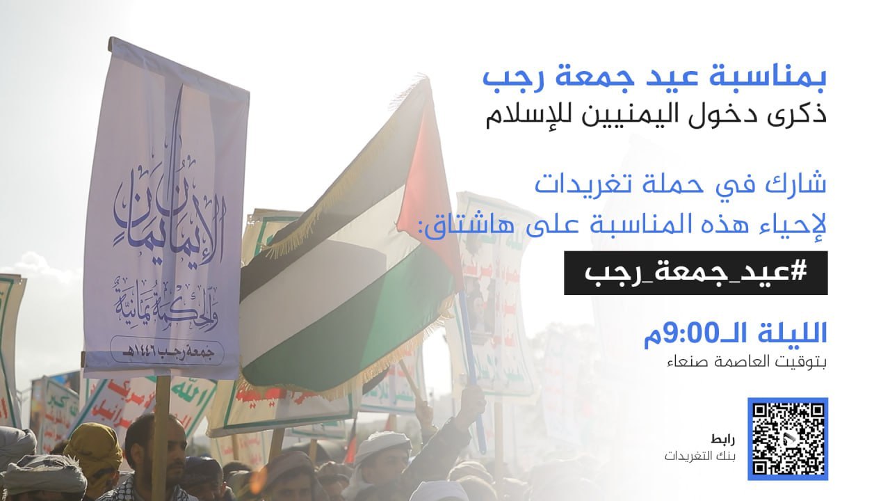 تنطلق في تمام الساعة التاسعة من مساء اليوم الجمعة، حملة تغريدات على موقع التواصل الاجتماعي “إكس”، بمناسبة عيد جمعة رجب، ذكرى دخول اليمنيين الإسلام.