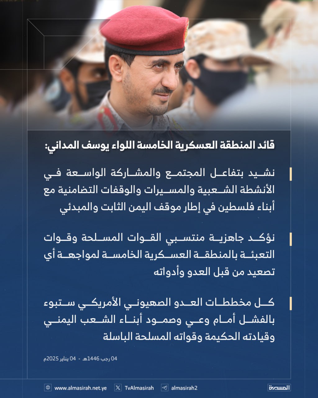 قائد المنطقة العسكرية الخامسة يؤكد الجهوزية التامة لمواجهة أي تصعيد من قبل العدوان وأدواته