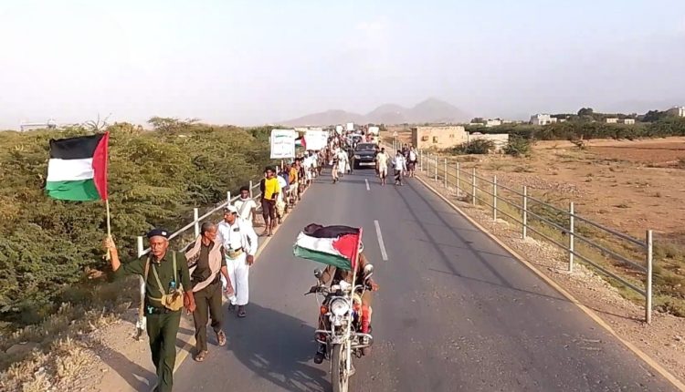 ورفع المشاركون خلال المسير العلمين اليمني والفلسطيني، مرددين شعارات الثورة وهتافات الحرية، تأكيدًا على تأييدهم لقرارات القيادة وعمليات القوات المسلحة اليمنية، لتعزيز النصرة للشعب الفلسطيني ومقاومته الباسلة.