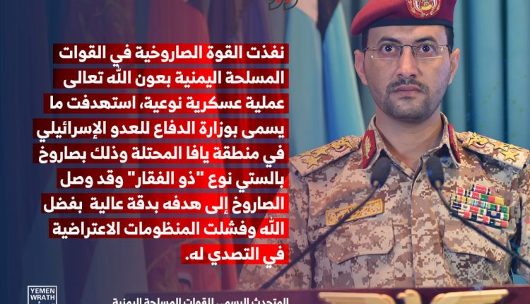 صور بيان القوات المسلحة اليمنية بشأن استهداف وزارة دفاع العدو الإسرائيلي في منطقة يافا المحتلة (إنفوجرافيك) يمانيون/ صور بيان القوات المسلحة اليمنية بشأن استهداف وزارة دفاع العدو الإسرائيلي في منطقة يافا المحتلة بصاروخ بالستي نوع ذو الفقار Share