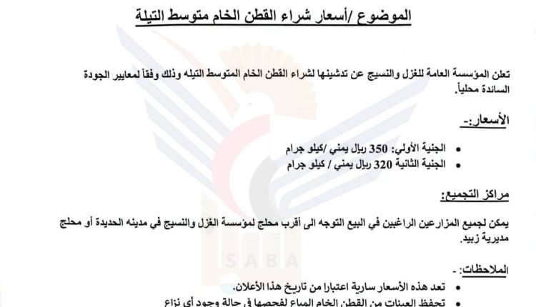 ودعت المؤسسة المزارعين الراغبين في بيع محصولهم التوجه إلى أقرب محلج تابع لها في مدينة الحديدة أو مديرية زبيد، مؤكدة أن هذه الأسعار سارية ابتداءً من تاريخ الإعلان.