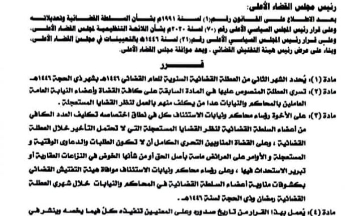 أصدر رئيس مجلس القضاء الأعلى القرار رقم 66 لسنة 1446هـ، الذي يحدد شهر ذي الحجة كشهر ثانٍ للعطلة القضائية السنوية.