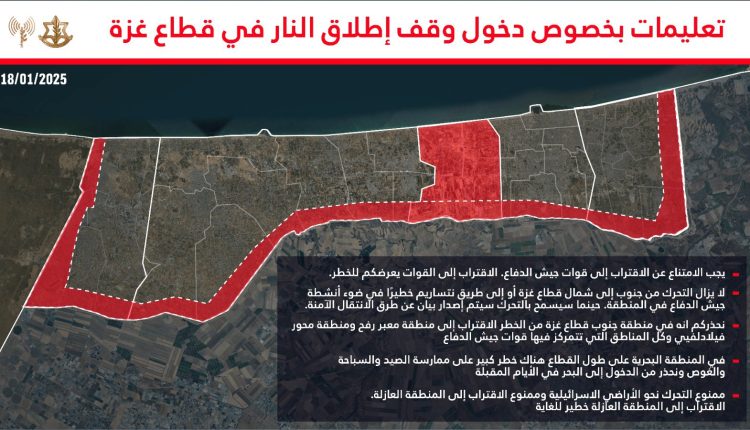 وأوضح البيان أن قوات الاحتلال ستظل متمركزة في بعض المناطق في غزة، داعيًا السكان إلى عدم الاقتراب من هذه المناطق، خصوصًا في محور نتساريم، كما حذر من الاقتراب من منطقة معبر رفح ومنطقة محور فيلادلفيا وكل مناطق تمركز القوات الإسرائيلية.