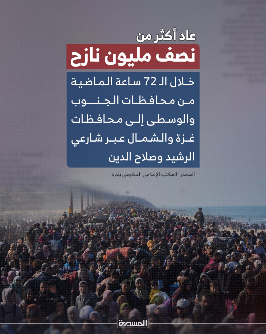 صورعربي ودولي المكتب الإعلامي الحكومي بغزة: عاد أكثر من نصف مليون نازحٍ خلال الـ72 ساعة الماضية من محافظات الجنوب والوسطى إلى محافظات غزة والشمال عبر شارعي الرشيد وصلاح الدين Share