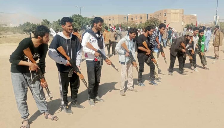مسير وتدريب قتالي لخريجي دورات التعبئة من طلاب الجامعات الأهلية في مديرية الثورة بالأمانة