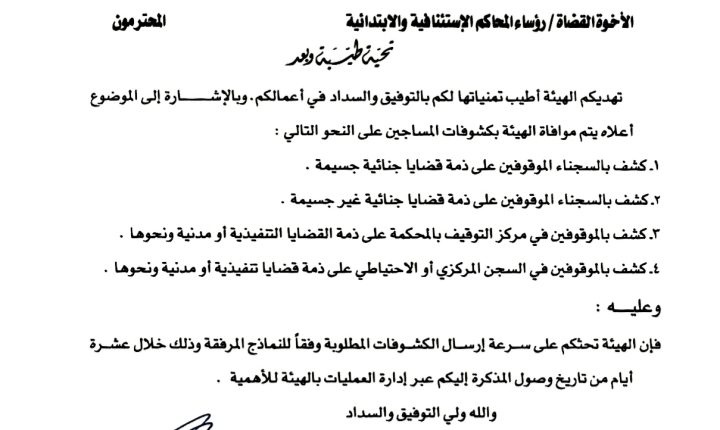 وجه التفتيش القضائي تعميمًا إلى رؤساء المحاكم الابتدائية والاستئنافية، يطالبهم برفع كشوفات السجناء والموقوفين، وذلك في إطار إجراءات تسبق حلول شهر رمضان المبارك 1446هـ.