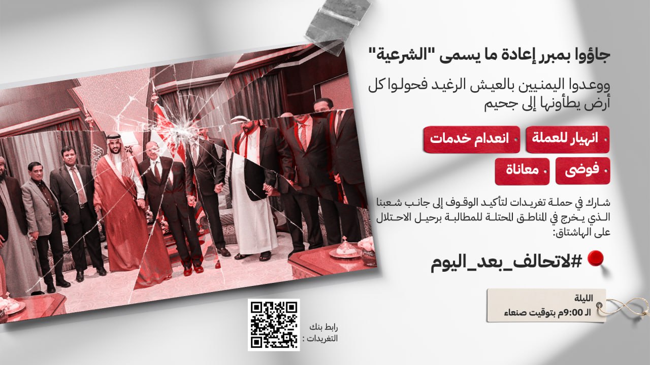 تنطلق في تمام الساعة التاسعة من مساء اليوم الأربعاء، حملة تغريدات على موقع التواصل الاجتماعي “إكس”، للمطالبة برحيل المحتل الذي جاء بمبرر إعادة ما يسمى بـ”الشرعية”، فعاثوا في الأرض فساداً وحولوا حياة المواطنين إلى جحيم، تسببوا في انهيار العملة، وانتشار الفوضى الأمنية، وعدم توفر الخدمات الضرورية.