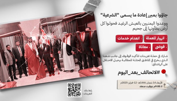 كما تساءل المغرّدون: “إلى متى يستمر هذا العبث؟”، داعين جميع أبناء اليمن إلى الوقوف صفًا واحدًا مع أحرار المحافظات المحتلة، من أجل استعادة السيادة والكرامة وطرد الغزاة ومرتزقتهم.