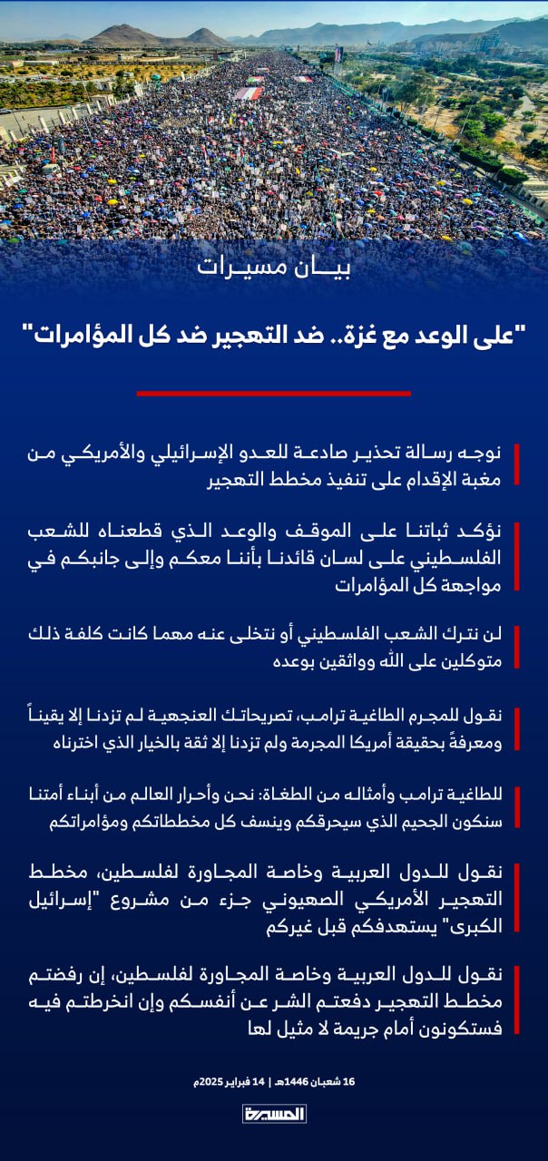 صور بيان مسيرات “على الوعد مع غزة.. ضد التهجير ضد كل المؤامرات” (إنفوجرافيك) يمانيون/ صور بيان مسيرات “على الوعد مع غزة.. ضد التهجير ضد كل المؤامرات” | 16 شعبان 1446هـ 14 فبراير 2025م Share