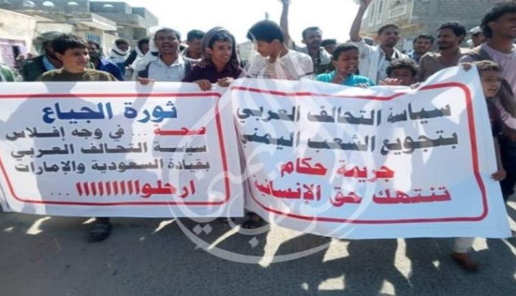 واتهم المحتجون، دول العدوان، بممارسة سياسة التركيع ضد أبناء المحافظات الجنوبية المحتلة، مؤكدين أن الاحتلال السعودي الإماراتي سلب القرار السيادي للحكومة المرتزقة الموالية له، ما تسبب في تفاقم معاناة الشعب اليمني.