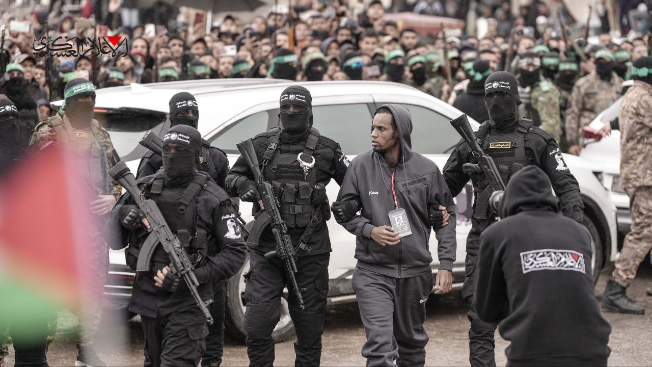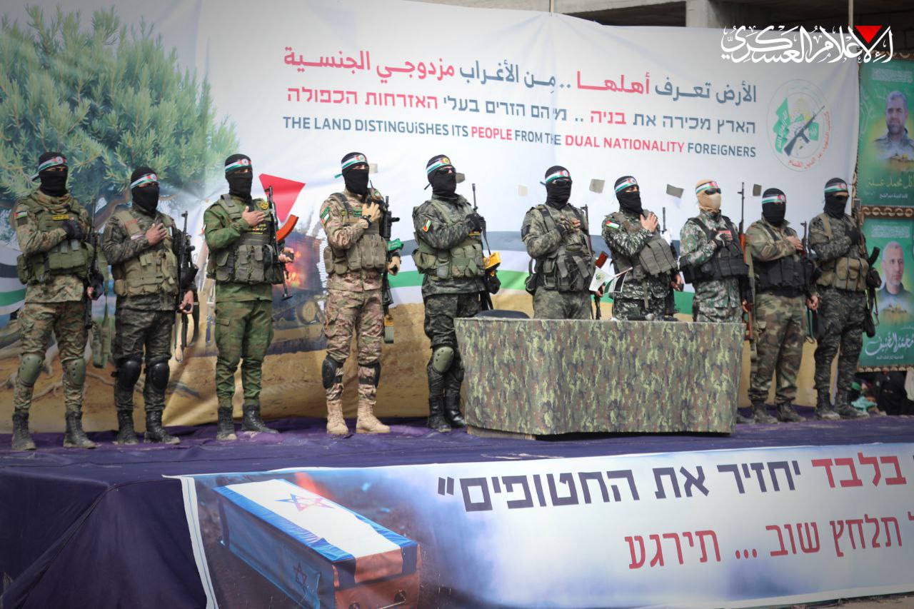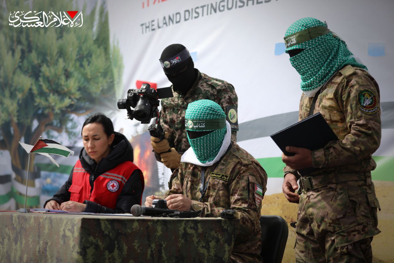 كتائب القسام تنشر صوراً من تسليم الأسرى ” تال شوهام ” و”أفيرا منغستو” و” إيليا ميمون اسحق كوهن” و”عمر شيم توف” و “عومر فنكرت” من الدفعة السابعة للأسرى الصهاينة في قطاع غزة ضمن المرحلة الأولى من “صفقة طوفان الأقصى” لتبادل الأسرى