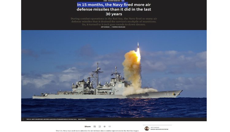 ولفت الموقع إلى ما نشرته البحرية الأمريكية في يناير أنها أطلقت ما يقرب من 400 ذخيرة منذ أكتوبر 2023 كجزء من العمليات القتالية في البحر الأحمر، بما في ذلك 120 صاروخًا من طراز SM-2، و80 صاروخًا من طراز SM-6، وإجمالي 20 صاروخًا من طراز Evolved Sea Sparrow (ESSM) وصاروخًا من طراز SM-3 . وتتراوح تكلفة الوحدة الواحدة من هذه الصواريخ بين 12.5 و28.7 مليون دولار أمريكي لصواريخ SM-3، وحوالي 4.3 مليون دولار أمريكي لصواريخ SM-6، وما يصل إلى 2.5 مليون دولار أمريكي لصواريخ SM-2، وفقًا لموقع The War Zone .
