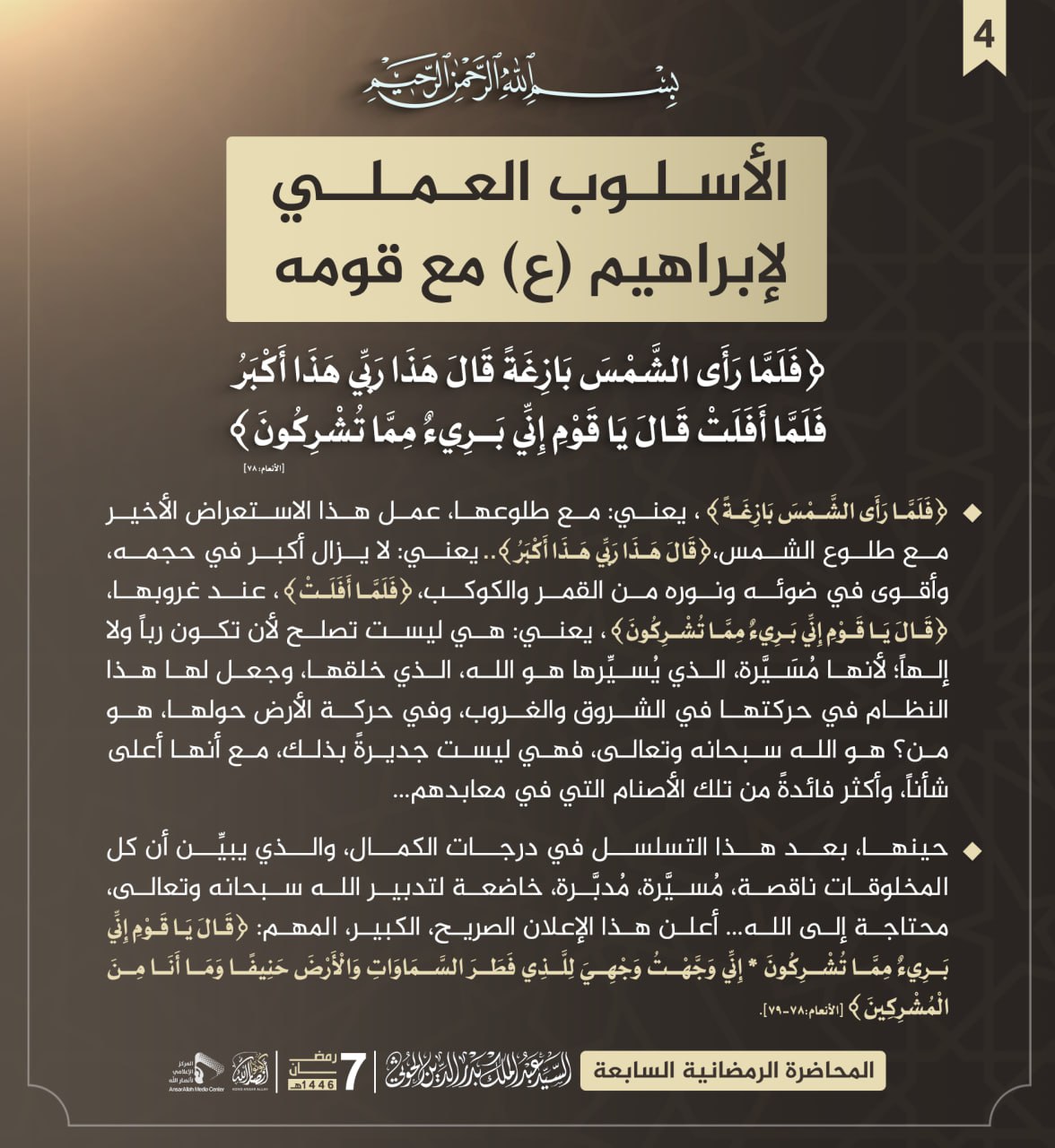 {فَلَمَّا رَأَى الشَّمْسَ بَازِغَةً قَالَ هَذَا رَبِّي هَذَا أَكْبَرُ فَلَمَّا أَفَلَتْ قَالَ يَا قَوْمِ إِنِّي بَرِيءٌ مِمَّا تُشْرِكُونَ} [الأنعام:78]