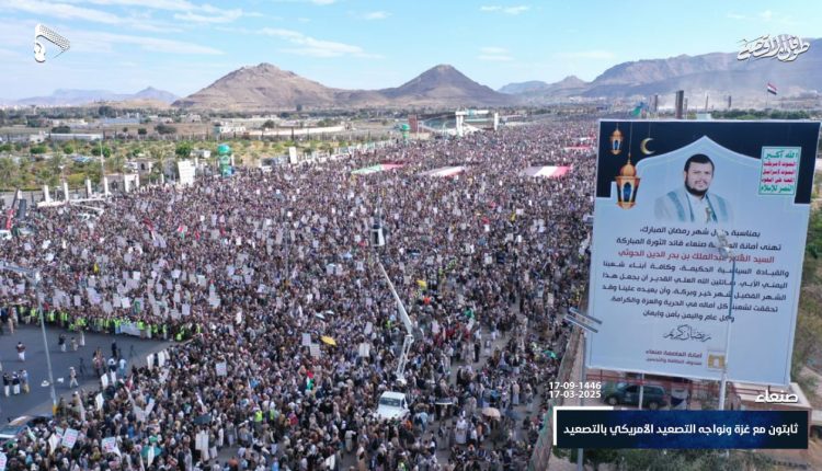 شاهد | في ذكرى غزوة بدر الكبرى.. طوفان بشري استثنائي في مليونية “ثابتون مع غزة ونواجه التصعيد الأمريكي بالتصعيد” بميدان السبعين في العاصمة صنعاء 17-09-1446هـ | 17-03-2025م