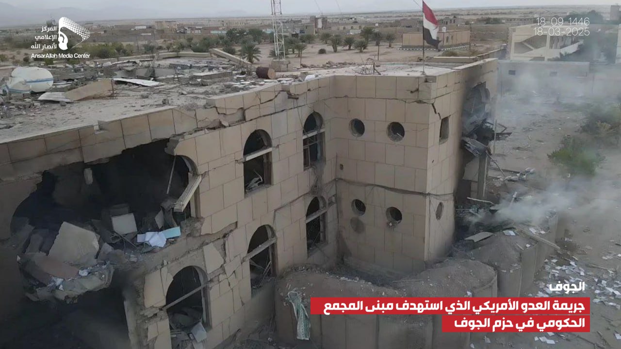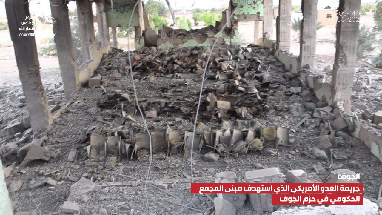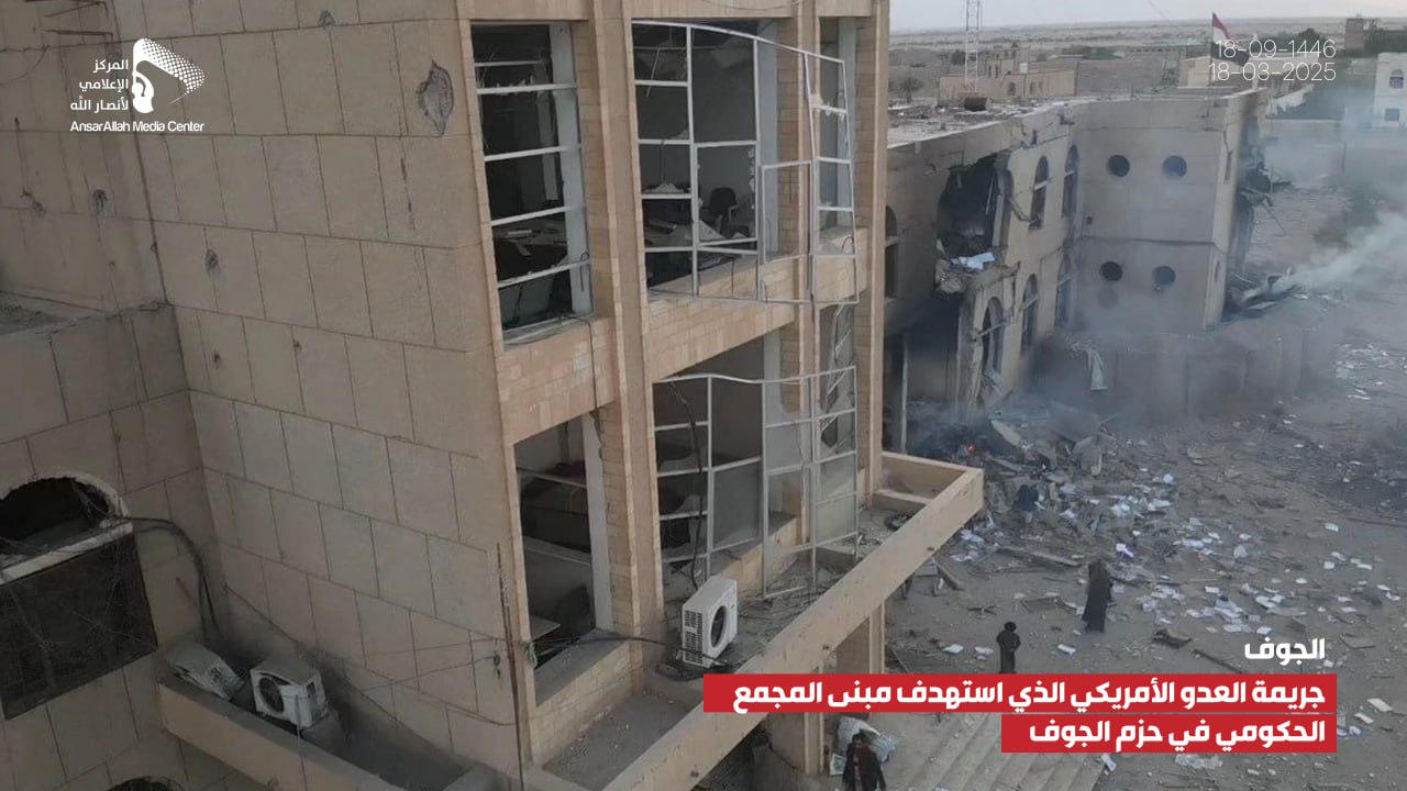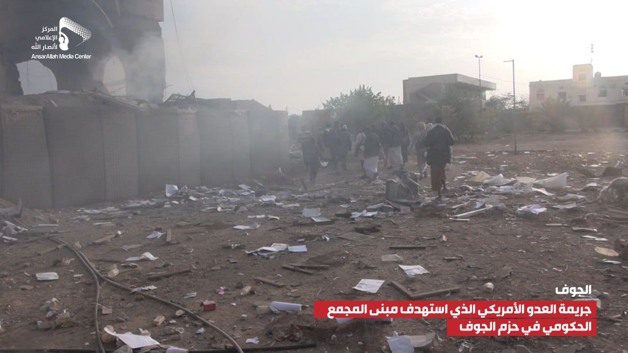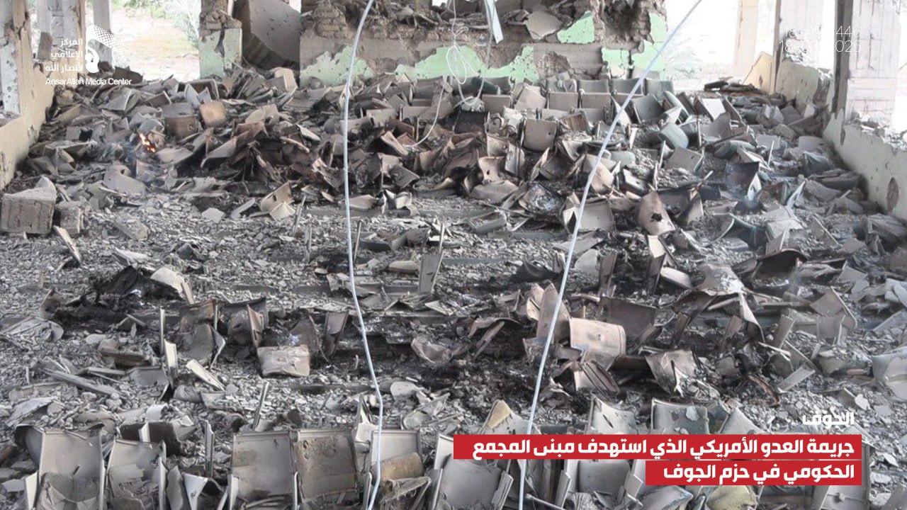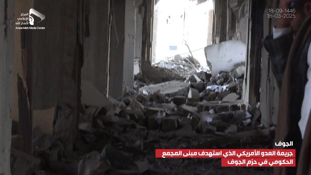 صور صور من جريمة العدوان الأمريكي الذي استهدف مبنى المجمع الحكومي بمديرية الحزم في الجوف يمانيون/ صور صور من جريمة العدوان الأمريكي الذي استهدف مبنى المجمع الحكومي بمديرية الحزم في الجوف 18-09-1446هـ | 18-03-2025م Share