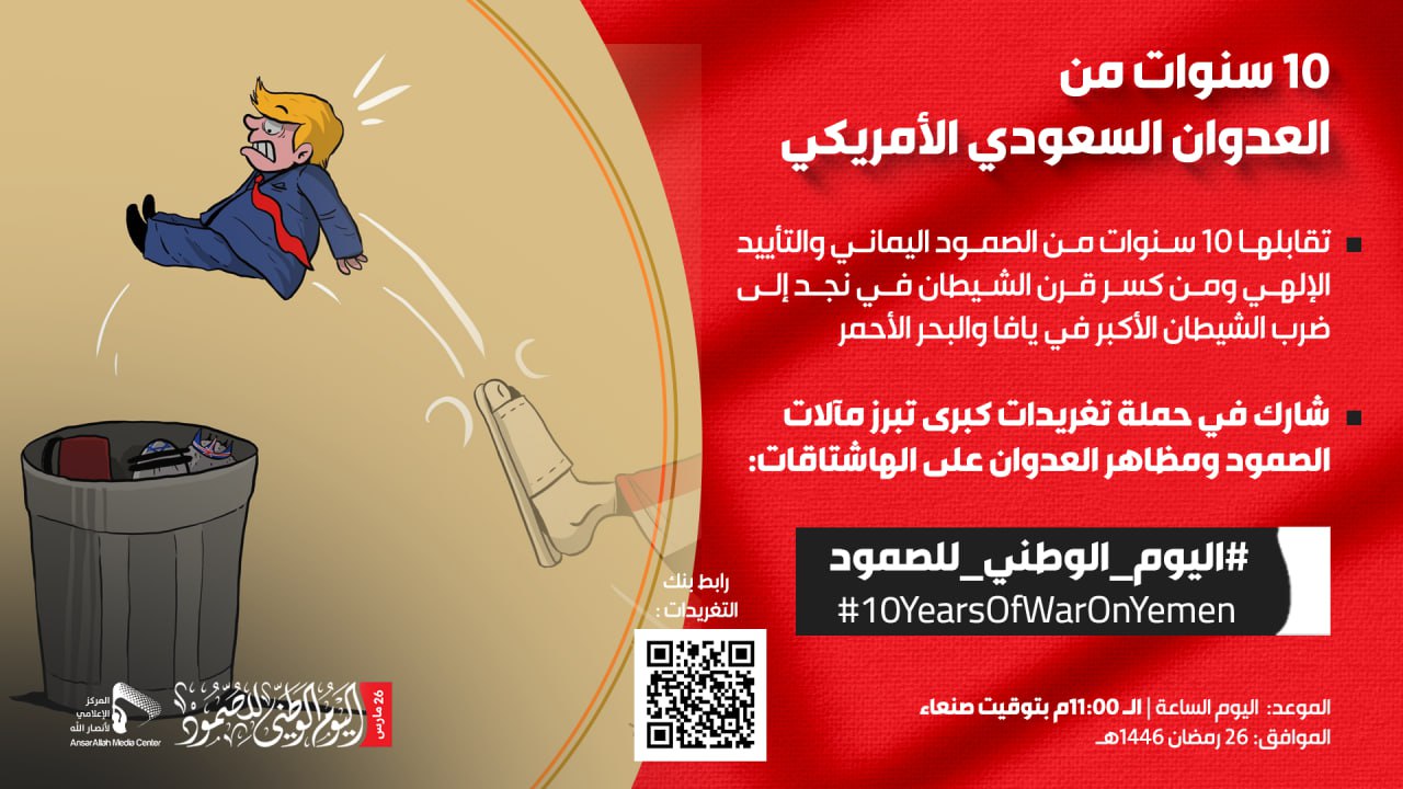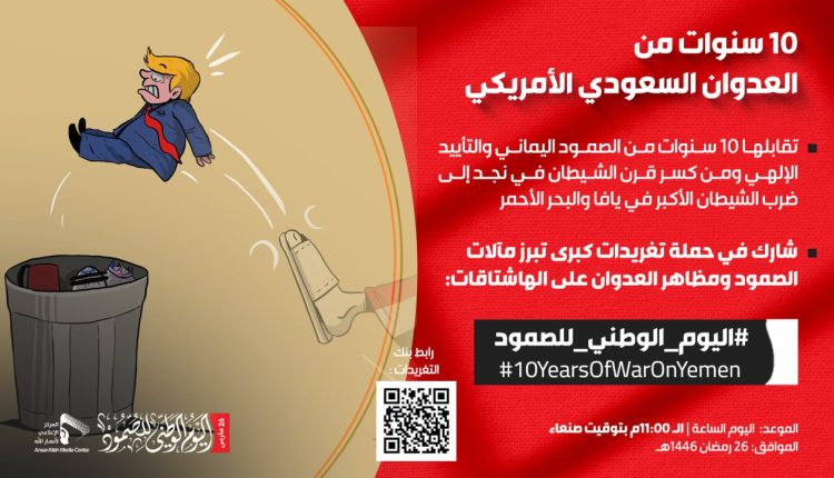 ودعا منظمو الحملة إلى المشاركة الفاعلة لتسليط الضوء على 10سنوات من الصمود اليماني والتأييد الإلهي