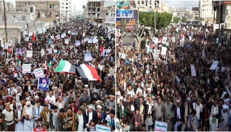 ورفع المشاركون في المسيرات العلمين اليمني والفلسطيني، ورددوا الهتافات المنددة بمجازر العدو الصهيوني بحق الشعب الفلسطيني في غزة والأراضي المحتلة، معلنين التحدي للعدوان الأمريكي على اليمن.