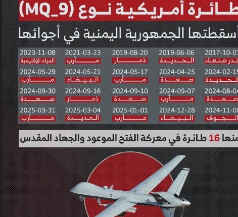 باسقاط الجيش اليمني لطائرة ام كيون 9 جديدة يصبح عدد الطائرات التي اسقطتها اليمن (20) طائرة أمريكية من نوع (MQ-9) ..