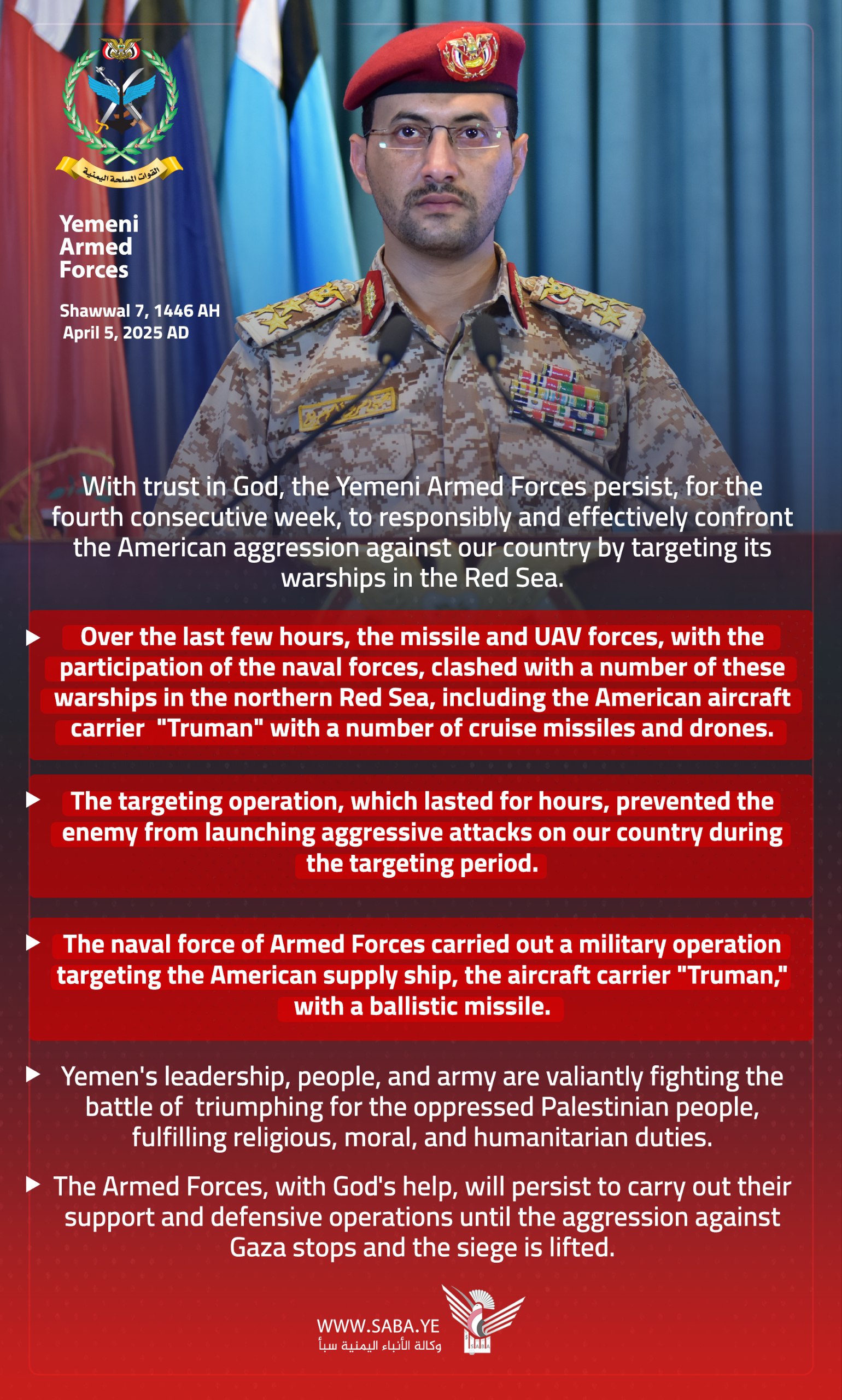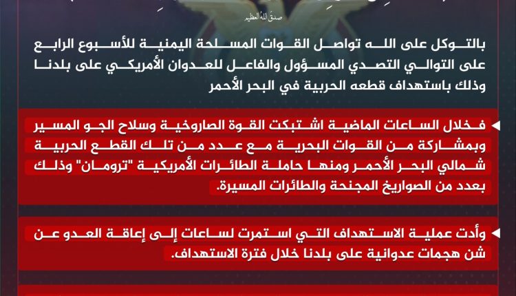 أخبار محليةصور انفوجرافيك ـ بيان القوات المسلحة اليمنية بشأن تنفيذ عملية اشتباك مع القطع الحربية المعادية شمالي البحر الأحمر وعلى رأسها حاملة الطائرات الأمريكية ترومان Share