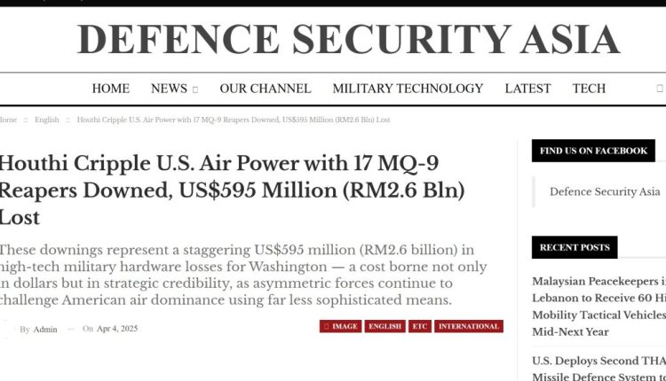 قال موقع الأمن الدفاعي في آسيا (ديفينس سيكيورتي آسيا) إن “الحوثيين تمكنوا من شل القوة الجوية الأمريكية وذلك من خلال إسقاط 17 طائرة إم كيو-9 ريبر ويكبدون واشنطن ما يقارب 595 مليون دولار”.
