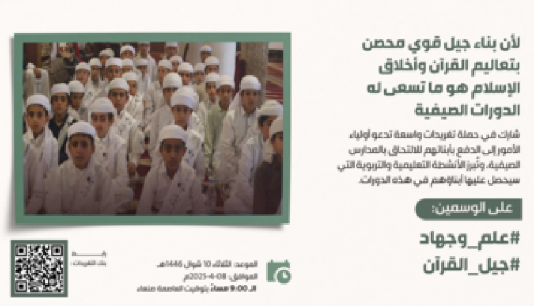 تنطلق في الساعة التاسعة من مساءاليوم الثلاثاء حملة تغريدات على موقع التواصل الاجتماعي “إكس” حول أهمية الدورات الصيفية في بناء جيل قوي محصن بتعاليم القرآن وأخلاق الإسلام.