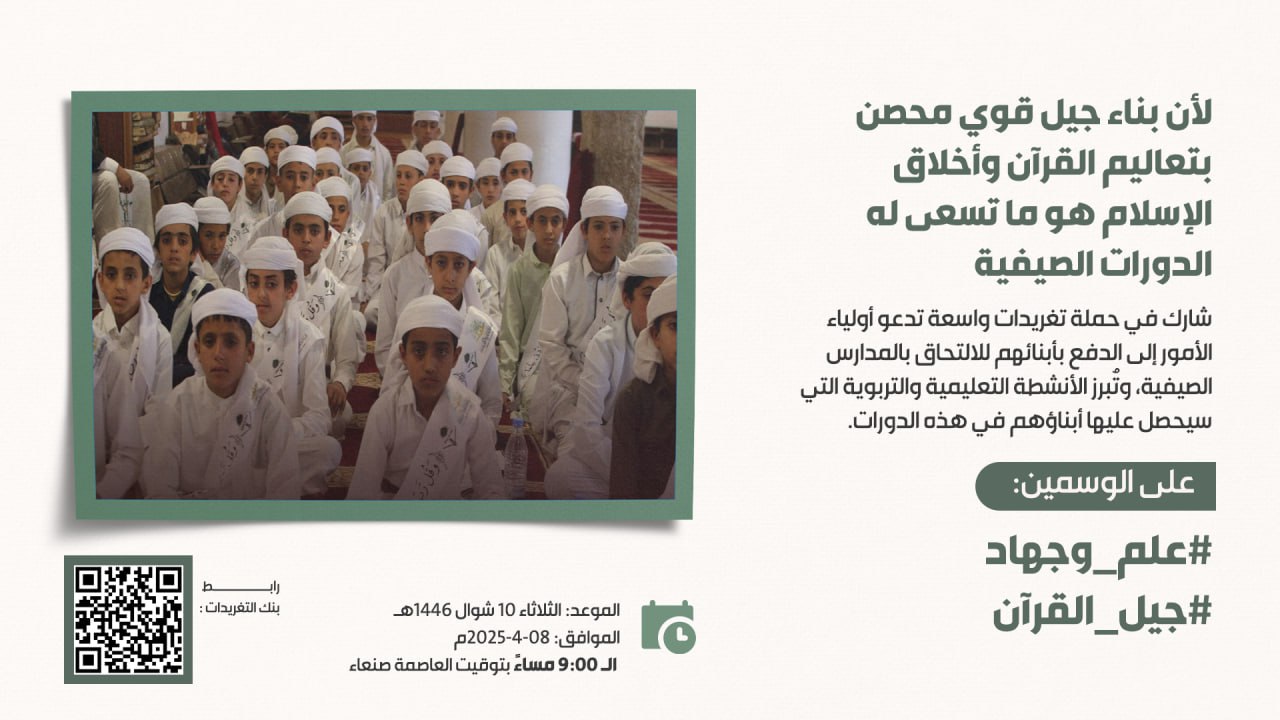 تنطلق في الساعة التاسعة مساء اليوم حملة تغريدات على موقع التواصل الاجتماعي “إكس” حول أهمية الدورات الصيفية في بناء جيل قوي محصن بتعاليم القرآن وأخلاق الإسلام.
