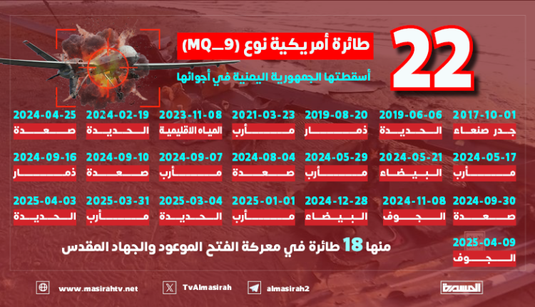 وبعونِ اللهِ تعالى تمكنتْ دفاعاتُنا الجويةُ من إسقاطِ طائرةٍ أمريكيةٍ معاديةٍ نوعِ MQ_9 وذلك أثناءَ قيامِها بمهامَ عدائيةٍ في أجواءِ محافظةِ الجوف وذلك بصاروخٍ مناسبٍ محليِّ الصنعِ وتعتبرُ هي الطائرةُ الثالثةُ التي تنجحُ دفاعاتُنا الجويةُ في إسقاطِها خلالَ عشَرةِ أيامٍ والثامنةَ عشرةَ خلالَ معركةِ الفتحِ الموعودِ والجهادِ المقدس إسناداً لغزة.