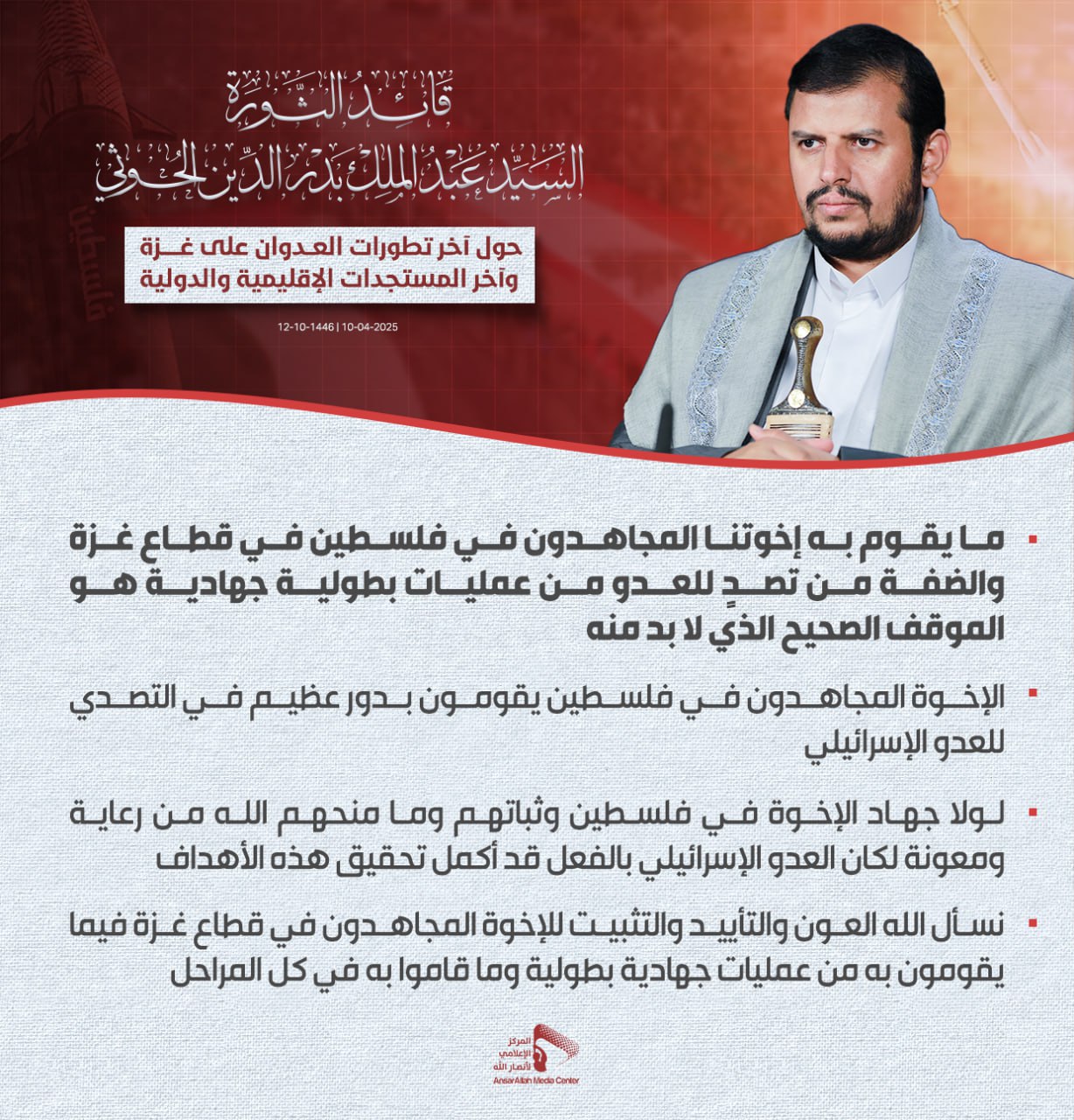 السيد عبدالملك بدرالدين الحوثي: ما يقوم به إخوتنا المجاهدون في فلسطين في قطاع غزة والضفة من تصدٍ للعدو من عمليات بطولية جهادية هو الموقف الصحيح الذي لا بد منه