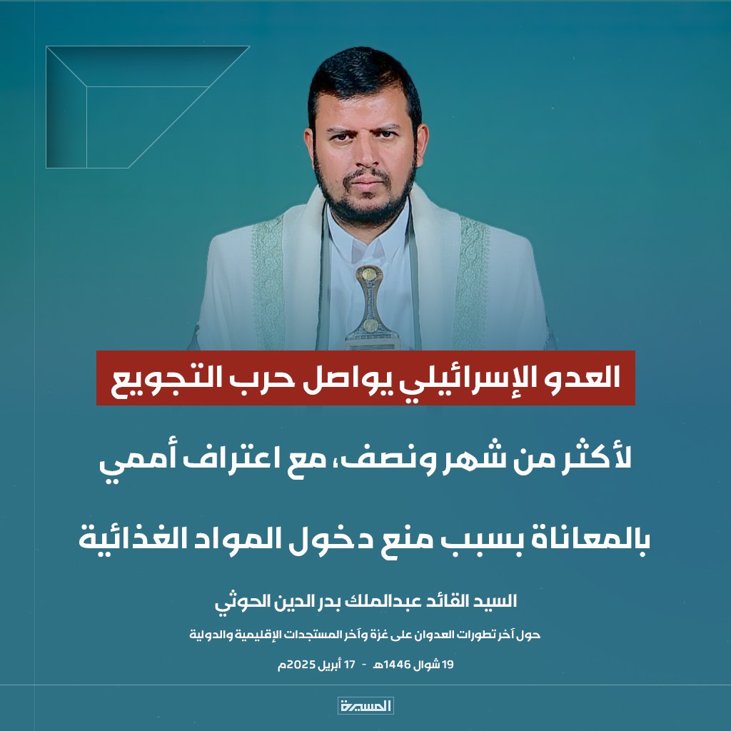 صور السيد القائد: العدو الإسرائيلي يمارس حرب التجويع في قطاع غزة لأكثر من شهر ونصف مع اعتراف أممي بالمعاناة (إنفوجرافيك) يمانيون/ صور السيد القائد: العدو الإسرائيلي يمارس حرب التجويع في قطاع غزة لأكثر من شهر ونصف مع اعتراف أممي بالمعاناة Share