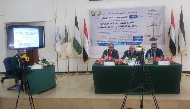 وخلال المناقشة، أشادت اللجنة بالمستوى العلمي المتميز للأطروحة، وموضوعها الحيوي المرتبط بمجال تنفيذ الأحكام القضائية، معتبرة إياها إضافة نوعية للمكتبة القانونية اليمنية.