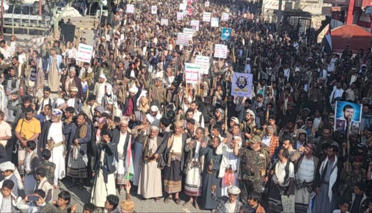 مسيرات جماهيرية حاشدة في البيضاء تنديداً بجرائم العدوان الأمريكي والصهيوني