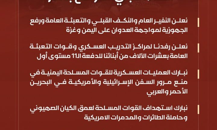 مكتبة الميديا انفوجرافيك ـ اللقاء القبلي الموسع بـ ذمار:نعلن النفير العام والنكف القبلي والتعبئة العامة ورفع الجهوزية لمواجهة العدوان على اليمن وغزة Share