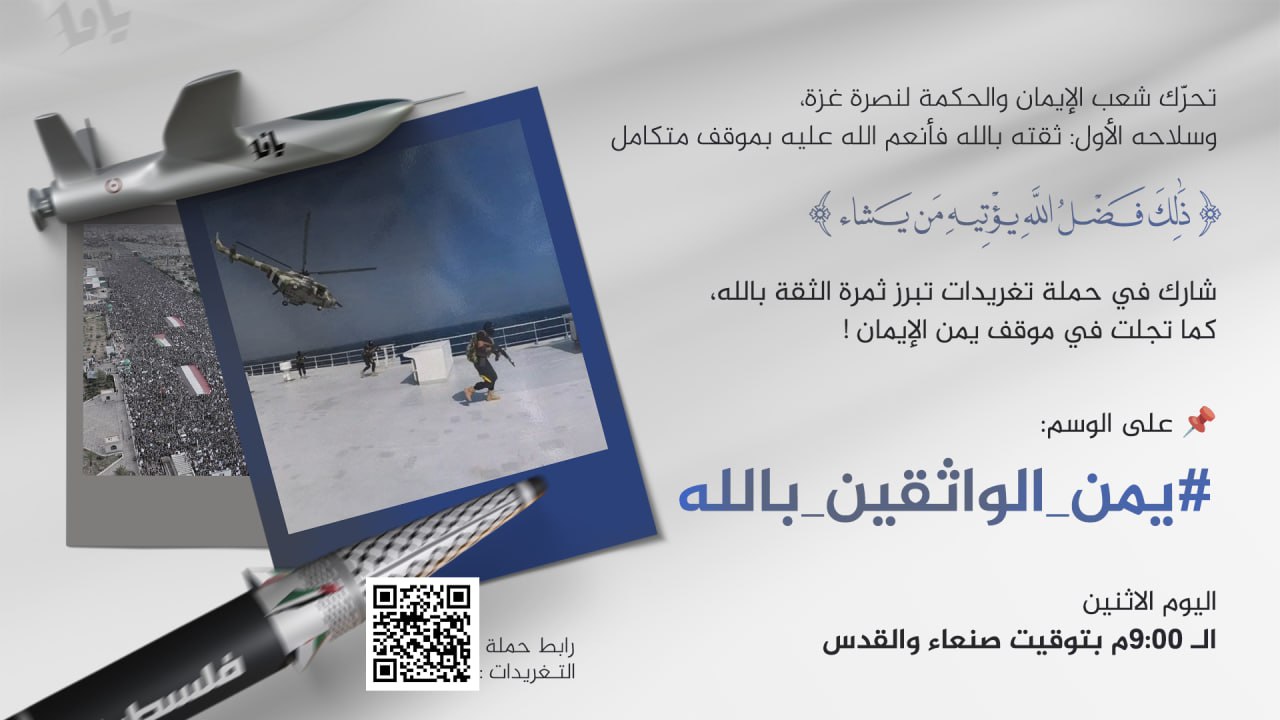 تنطلق في الساعة التاسعة من مساء اليوم، حملة تغريدات على موقع التواصل الاجتماعي “إكس” حول موقف وتحرك الشعب اليمني لنصرة غزة والذي يعد ثمرة لثقته بالله سبحانه وتعالى.