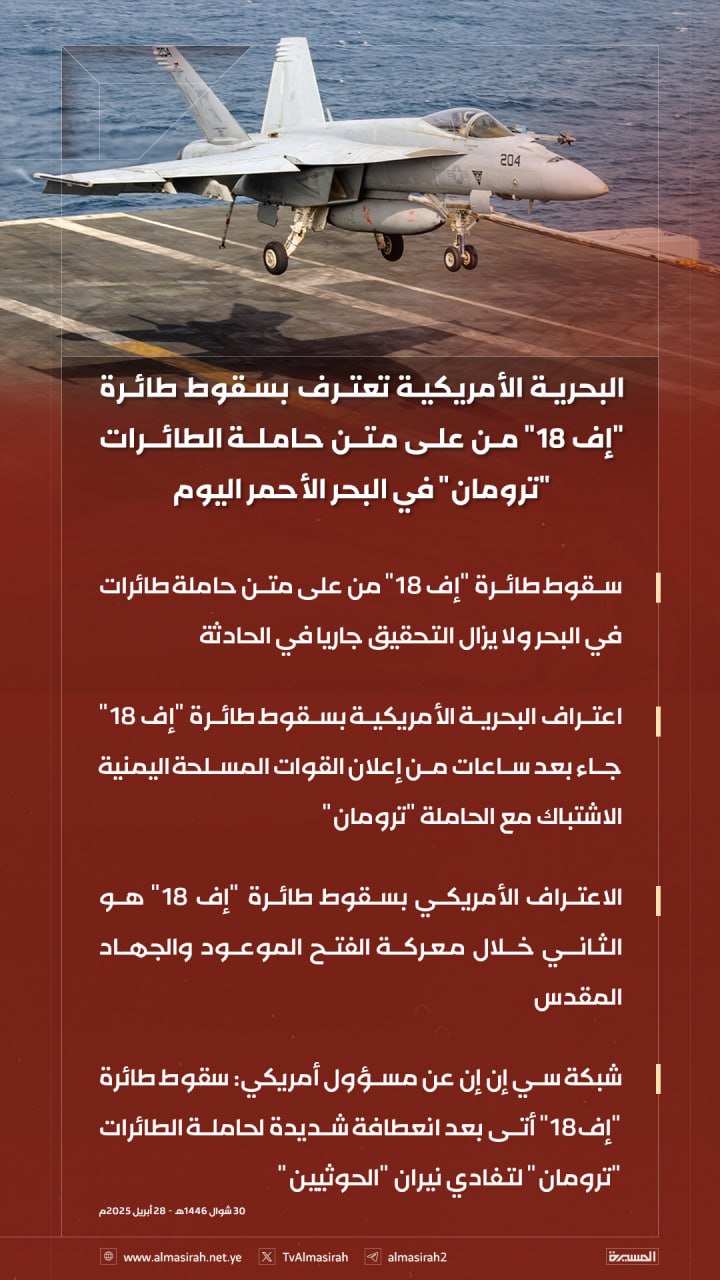 صور الاعتراف الأمريكي بسقوط طائرة “إف 18” هو الثاني خلال معركة الفتح الموعود والجهاد المقدس (إنفوجرافيك) يمانيون/ صور الاعتراف الأمريكي بسقوط طائرة “إف 18” هو الثاني خلال معركة الفتح الموعود والجهاد المقدس Share