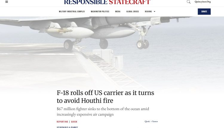 نشر موقع “Responsible Statecraft” التابع لمعهد كوينسي المتخصص في السياسة الخارجية للولايات المتحدة تقريرًا يفيد بفقدان البحرية الأمريكية لطائرة مقاتلة من طراز F/A-18 سوبر هورنت، تقدر قيمتها بما لا يقل عن 67 مليون دولار. وذكر التقرير أن الطائرة سقطت من على متن حاملة الطائرات يو إس إس هاري إس ترومان أثناء قيامها بمناورة صعبة لتجنب نيران الحوثيين في البحر الأحمر”.