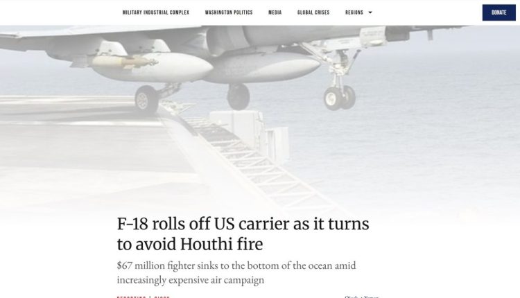 كشف موقع Responsible Statecraft، التابع لمعهد كوينسي المعني بالسياسة الخارجية الأمريكية، عن سقوط مقاتلة أمريكية من طراز F/A-18 سوبر هورنت تقدر قيمتها بنحو 67 مليون دولار، أثناء وجودها على متن حاملة الطائرات “يو إس إس هاري إس ترومان” في البحر الأحمر، في وقت وصف فيه الموقع الحملة الأمريكية ضد اليمن بـ”باهظة التكاليف وعديمة الجدوى”.
