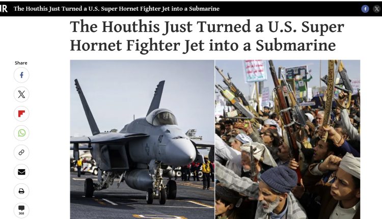 نشرت مجلة ناشيونال ريفيو الأمريكية تقريرًا مطولًا للكاتب جيم غيراغتي، تحت عنوان ساخر: “الحوثيون حوّلوا مقاتلة سوبر هورنيت أمريكية إلى غواصة”. التقرير تناول تصاعد الخسائر الأمريكية في المواجهة مع اليمن، مشيرًا إلى حادثة إسقاط طائرة متطورة من طراز F/A-18E Super Hornet في البحر الأحمر.