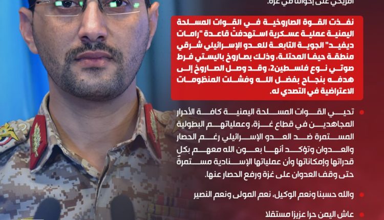 بيان القوات المسلحة اليمنية بشأن استهداف قاعدة “رامات ديفيد” الجوية التابعة للعدو الإسرائيلي شرقيِّ منطقة “حيفا” المحتلة بصاروخ باليستي فرط صوتي نوع (فلسطين2) وصل إلى هدفه بنجاح 04-11-1446هـ | 02-04-2025م