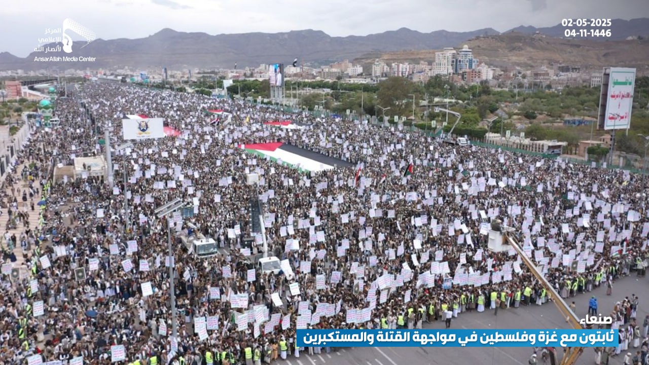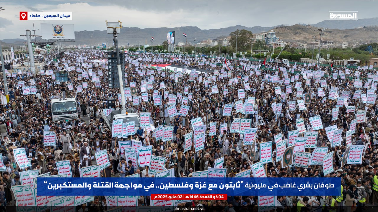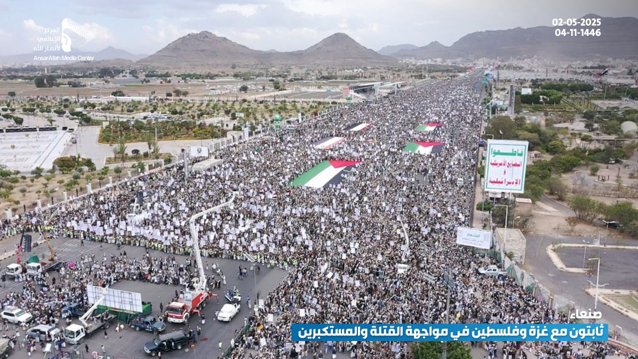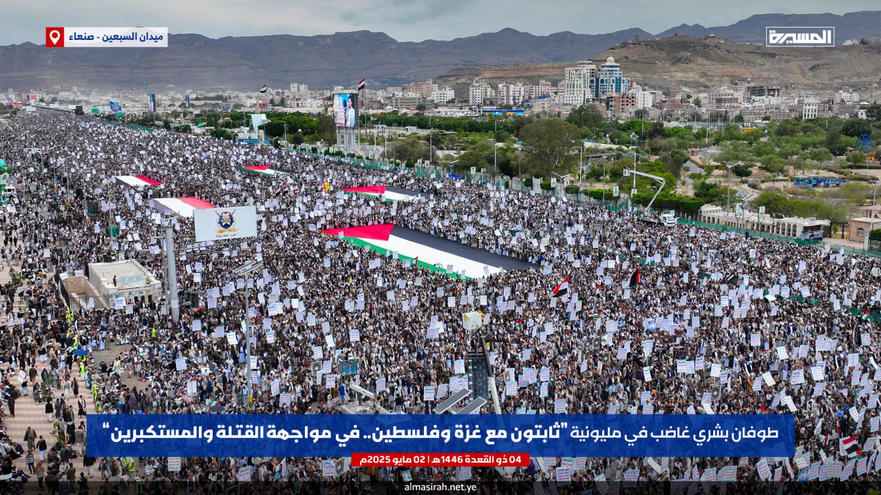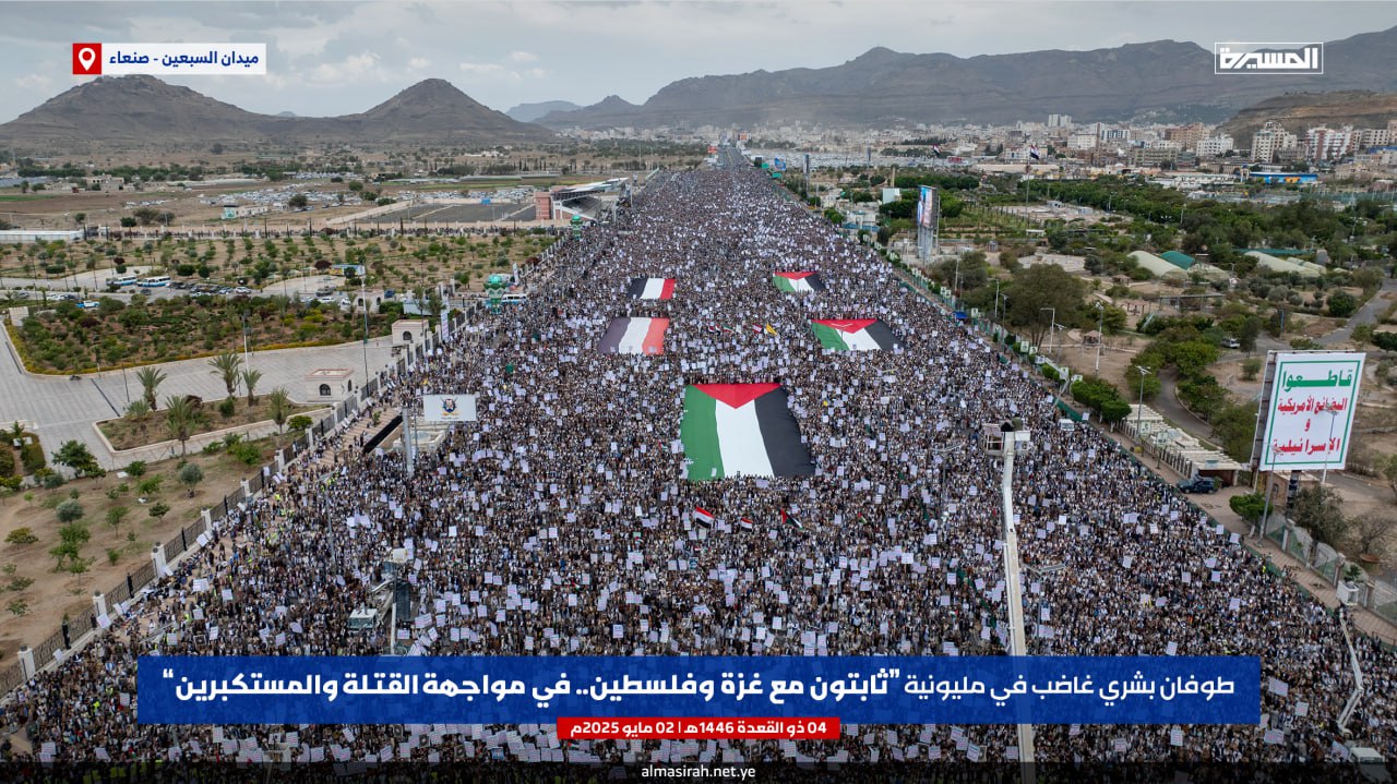 صور جوية| بالتزامن مع الصواريخ اليمنية نحو الكيان طوفان يمني يصفع العدو الأمريكي… حشود مليونية في مسيرة “ثابتون مع غزة وفلسطين.. في مواجهة القتلة والمستكبرين” بميدان السبعين في العاصمة صنعاء 04-11-1446هـ | 02-05-2025م