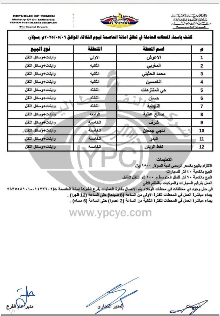شركة النفط تعلن أسماء المحطات العاملة في أمانة العاصمة ليوم غد الثلاثاء 6 مايو 2025م