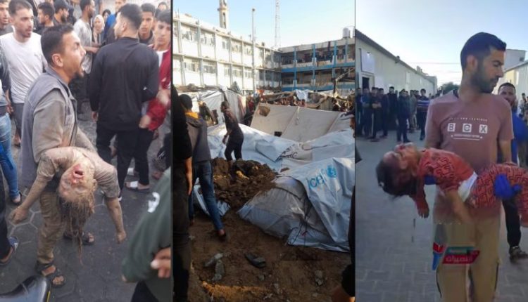 أستشهد 40 مدنياً وأصيب نحو 100 أخرين بقصف جوي للعدو الصهيوني استهدف مدرسة أبو هميسة التي تؤوي آلاف النازحين في بلوك عشرة بمخيم البريج ومخيم المناصرة للنازحين شرق مدينة دير البلح ومجموعة من المواطنين في منطقة السوارحة غربي النصيرات.