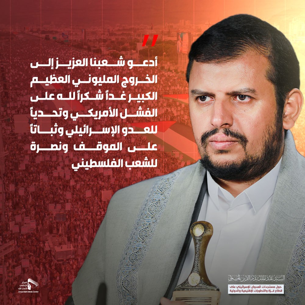 السيد عبدالملك بدرالدين الحوثي: أدعو شعبنا العزيز إلى الخروج المليوني العظيم الكبير غداً شكراً لله على الفشل الأمريكي وتحدياً للعدو الإسرائيلي وثباتاً على الموقف ونصرة للشعب الفلسطيني
