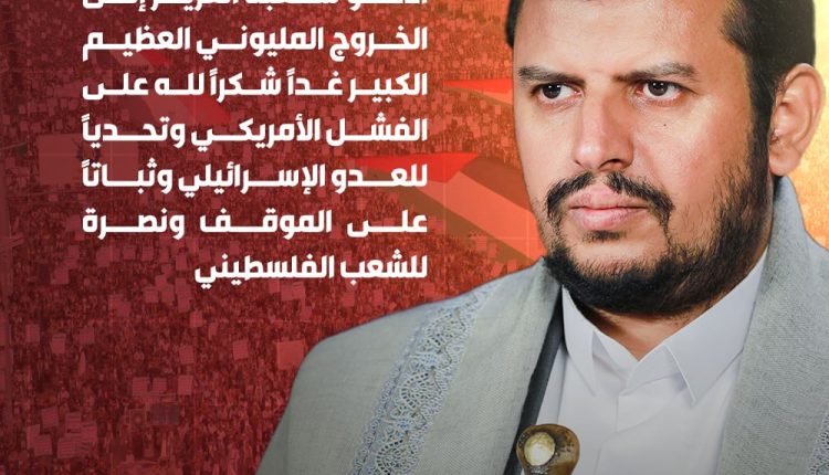 السيد القائد: أدعو شعبنا العزيز إلى الخروج المليوني العظيم يوم غد شكراً لله على الفشل الأمريكي وتحدياً للعدو الإسرائيلي (إنفوجرافيك)