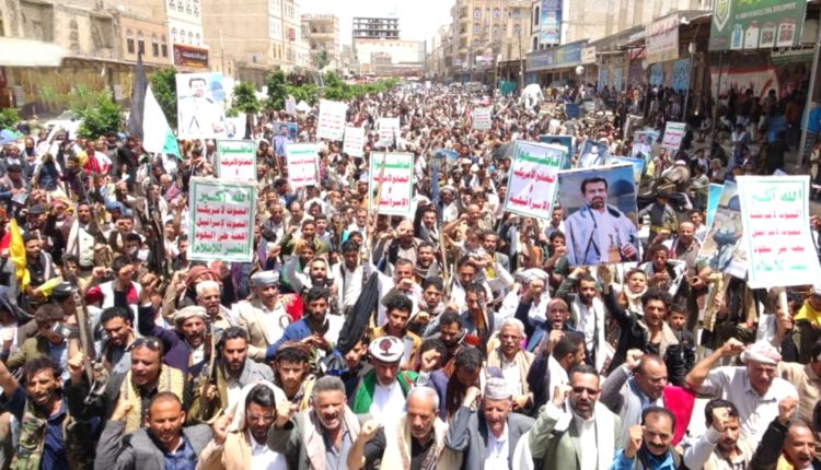 ورفع المشاركون في المسيرات التي تقدّمها في دمت القائم بأعمال المحافظ عبداللطيف الشغدري، العلمين اليمني والفلسطيني، مرددين شعارات البراءة من أمريكا وإسرائيل والخونة والعملاء والجواسيس.