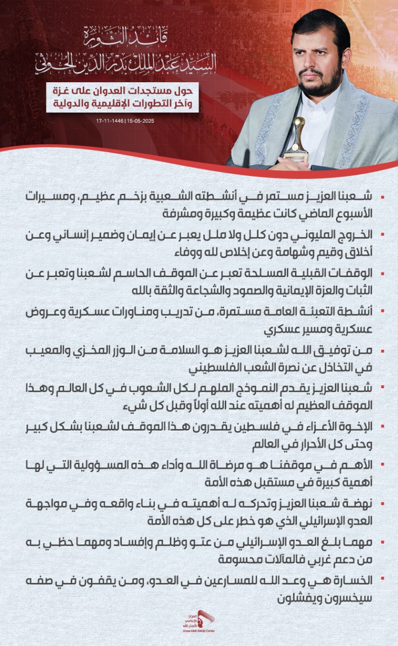 السيد عبدالملك بدرالدين الحوثي: شعبنا العزيز يقدم النموذج الملهم لكل الشعوب في كل العالم وهذا الموقف العظيم له أهميته عند الله أولاً وقبل كل شيء