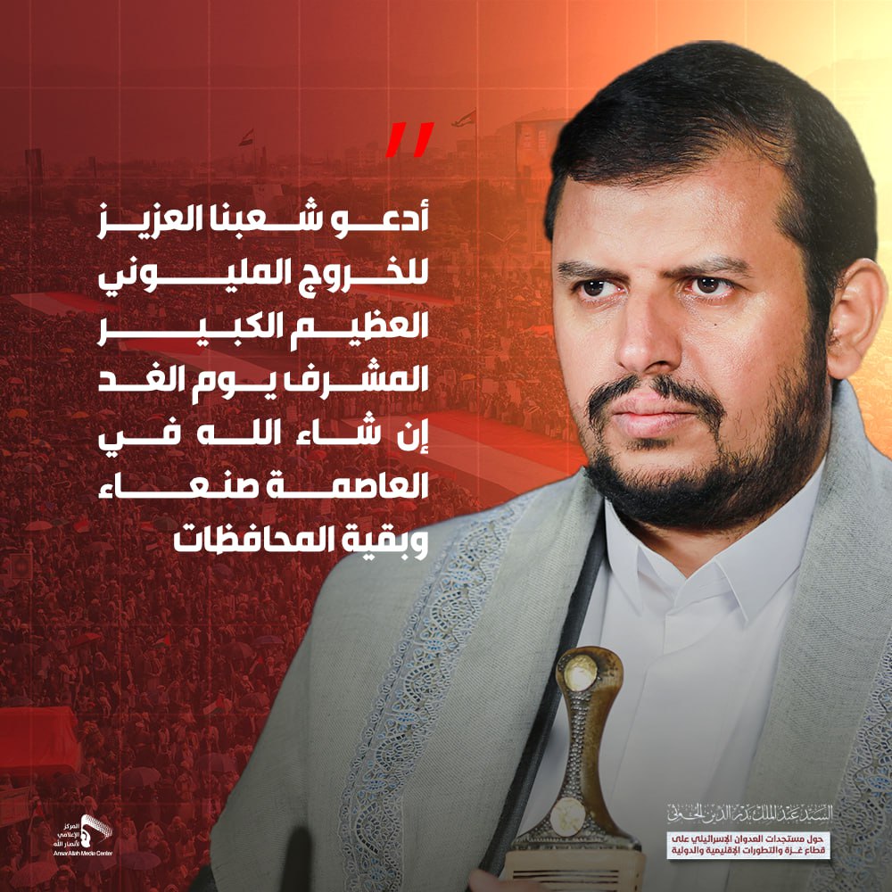 السيد عبدالملك بدرالدين الحوثي: أدعو شعبنا العزيز للخروج المليوني العظيم الكبير المشرف يوم الغد إن شاء الله في العاصمة صنعاء وبقية المحافظات